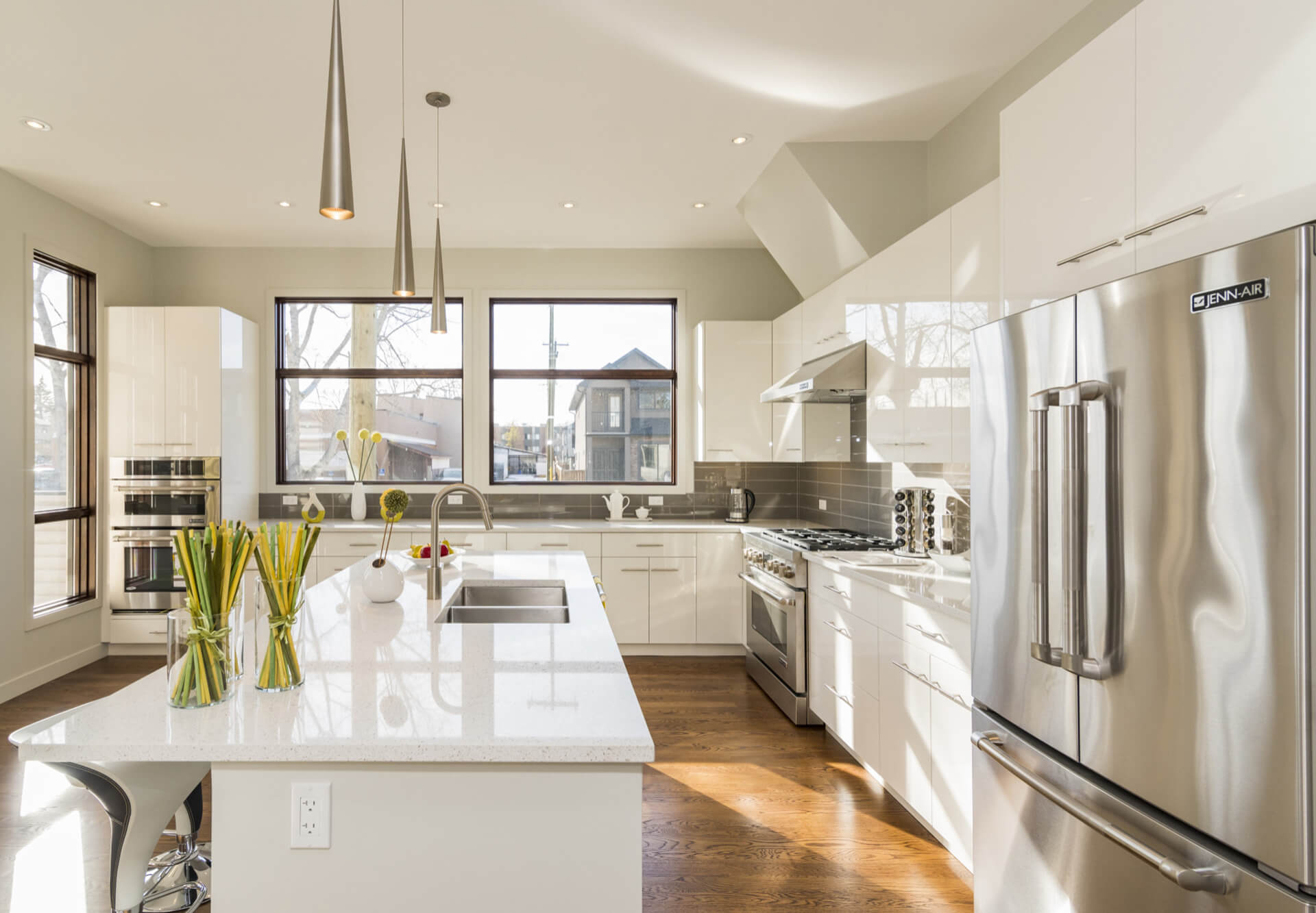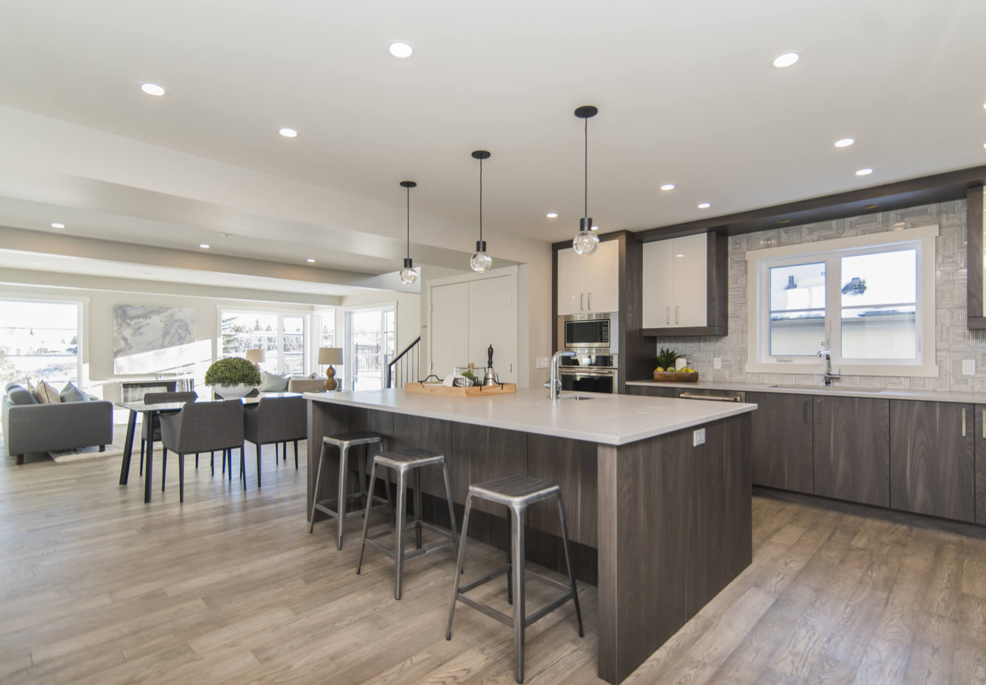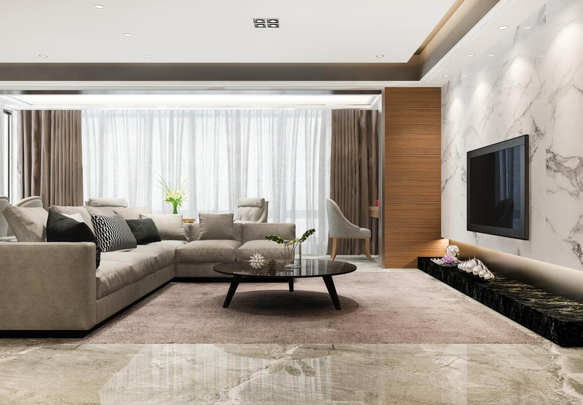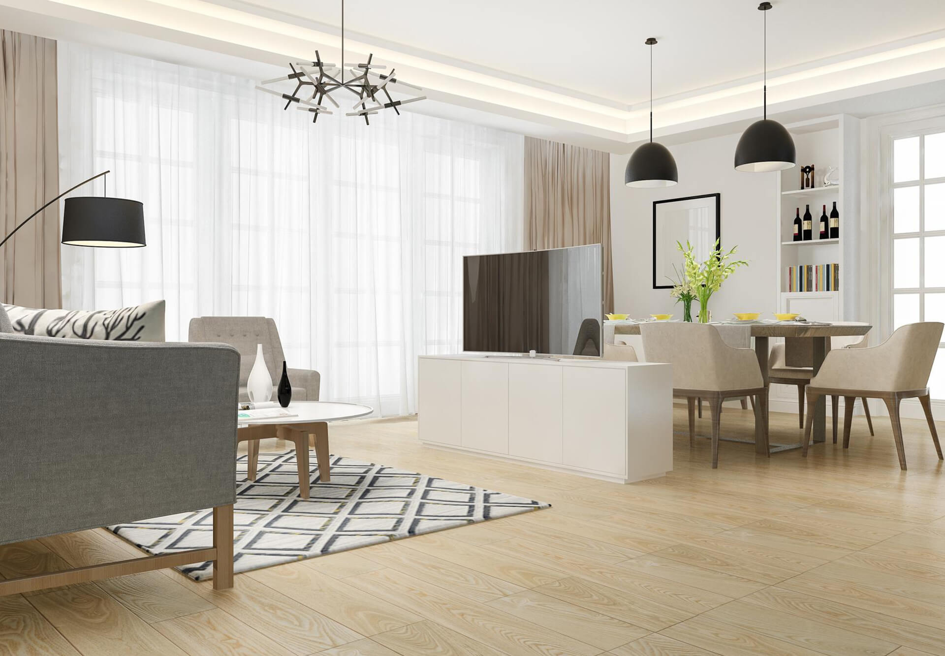 ➖ Sala para dois ambientes com piso em porcelanato, cozinha americana com armários planejados e área de serviço.